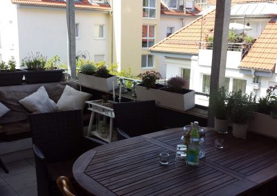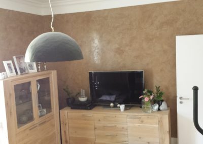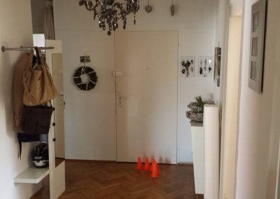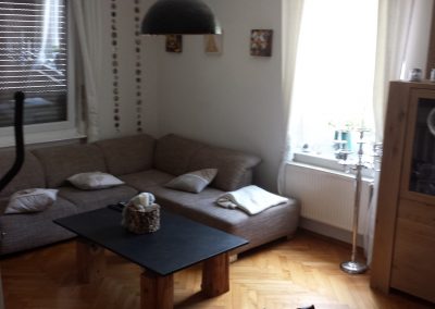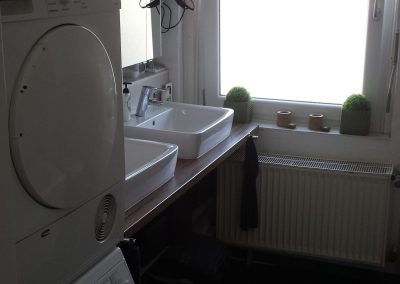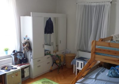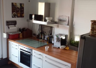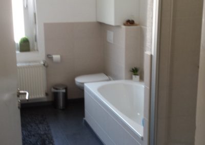 Parkett und Laminatböden, Decken und Wände z.T. Raufaser weißgestrichen, z.T weiße Tapete, großes Wohnzimmer mit Wänden teilweise ital. Spachteltechnik (braun), Türen weiß lackiert, großes Schlafzimmer, Kinderzimmer mit davor liegendem Durchgangszimmer, zentrale Diele, Bad mit Wanne und Dusche, WM- + Trocknerplatz, Wand-WC und zwei Solitär-WB auf Holzplatte, Gäste-WC mit Wand-WC, Abstellraum, neuwertige Einbauküche mit hochwertigen Elektrogeräten und übergroßem Induktionskochfeld, Terrasse ca. 15 m²